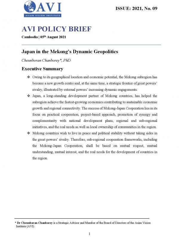 AVI POLICY BRIEF ISSUE: 2021, NO. 09 | Japan in the Mekong’s Dynamic Geopolitics