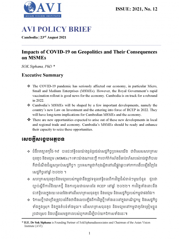 AVI POLICY BRIEF ISSUE: 2021, NO. 12 | Impacts of COVID-19 on Geopolitics and Their Consequences on MSMEs