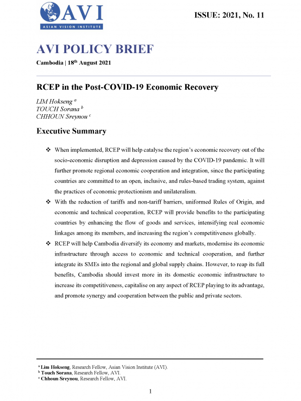 AVI POLICY BRIEF ISSUE: 2021, NO. 11 | RCEP in the Post-COVID-19 Economic Recovery