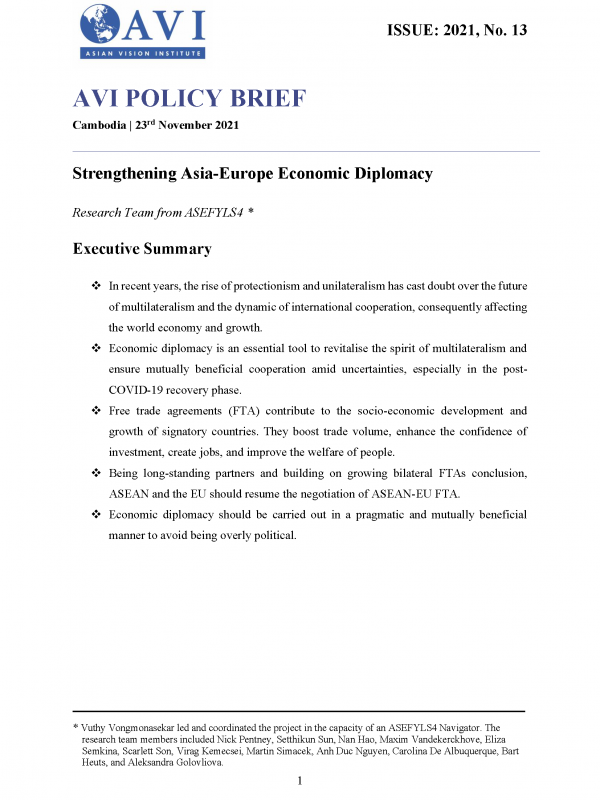AVI POLICY BRIEF ISSUE: 2021, No. 13 | Strengthening Asia-Europe Economic Diplomacy