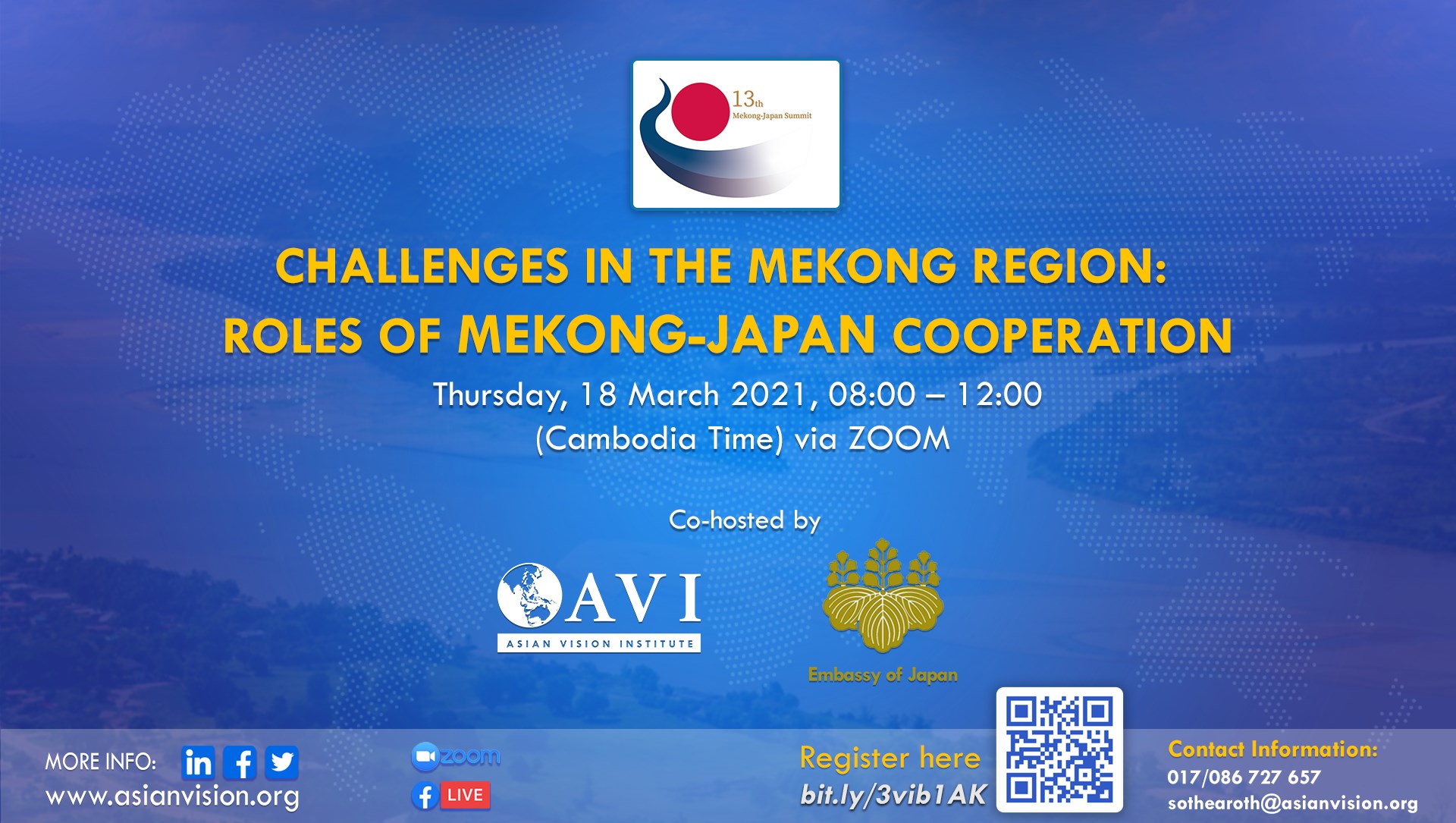 The Asian Vision Institute (AVI) and the Embassy of Japan in Phnom Penh will co-organise a seminar on “Challenges in the Mekong-Region: Roles of Mekong-Japan Cooperation” on Thursday 18th March 2021 from 08:00 AM to 12:00 PM (Cambodia Time) via ZOOM. The seminar is aimed at identifying challenges facing the Mekong region so that policymakers and other stakeholders can better comprehend and assess associated risks at the national and regional levels
