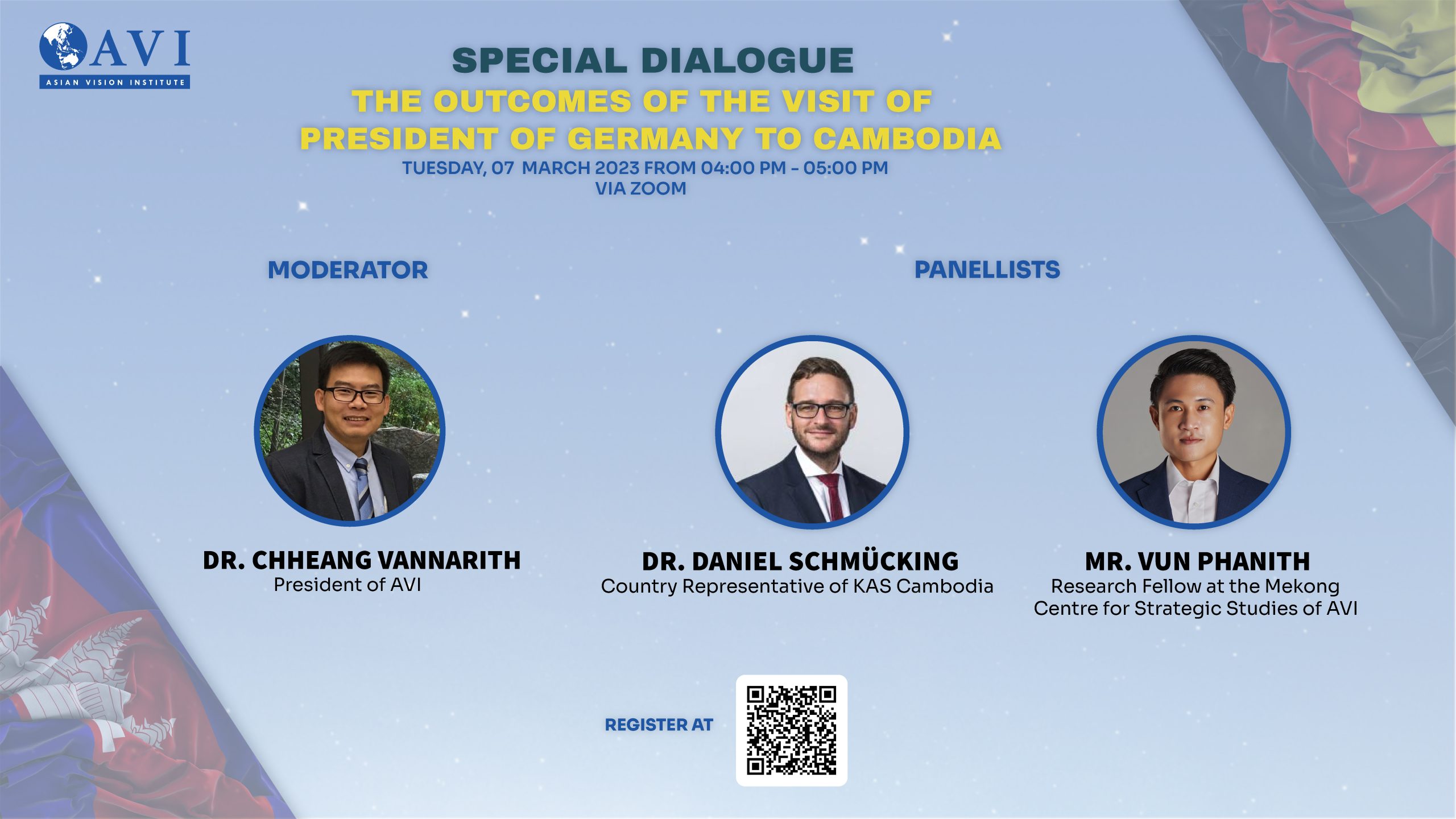 The Asian Vision Institute is going to organise a Special Dialogue on “the Outcomes of the Visit of President of Germany to Cambodia” on Tuesday, 07 March 2023 (from 4:00 PM to 5:00 PM) via ZOOM. The objectives of this dialogue are to reflect on the key outcomes of the historical visit of President of the Federal Republic of Germany to the Kingdom of Cambodia and to highlight the significance of this visit for bilateral relations, particularly on enhancing and expanding bilateral cooperation in prioritised areas.
