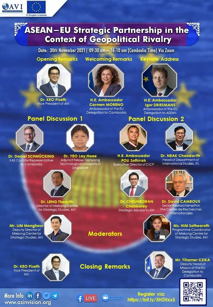 The Asian Vision Institute (AVI) and the the EU Delegation to Cambodia will co-organise the webinar on “ASEAN-EU Strategic Partnership in the Context of Geopolitical Rivalry” on Tuesday, 30th November 2021 from 9:30 am to 04:10 pm (Cambodia Time) via ZOOM.