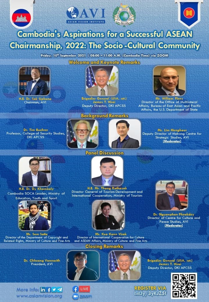 Meet our prominent scholars and policymakers in this webinar on Friday, 10th September 2021 from 08:00am to 11:00am via ZOOM. The webinar will mainly focus on “What are the main goals and priorities of building ASEAN Socio-Cultural Community?” “How could they be achieved during Cambodia’s ASEAN Chairmanship in 2022?” and “What could be the main challenges and obstacles in realising those goals and priorities?”