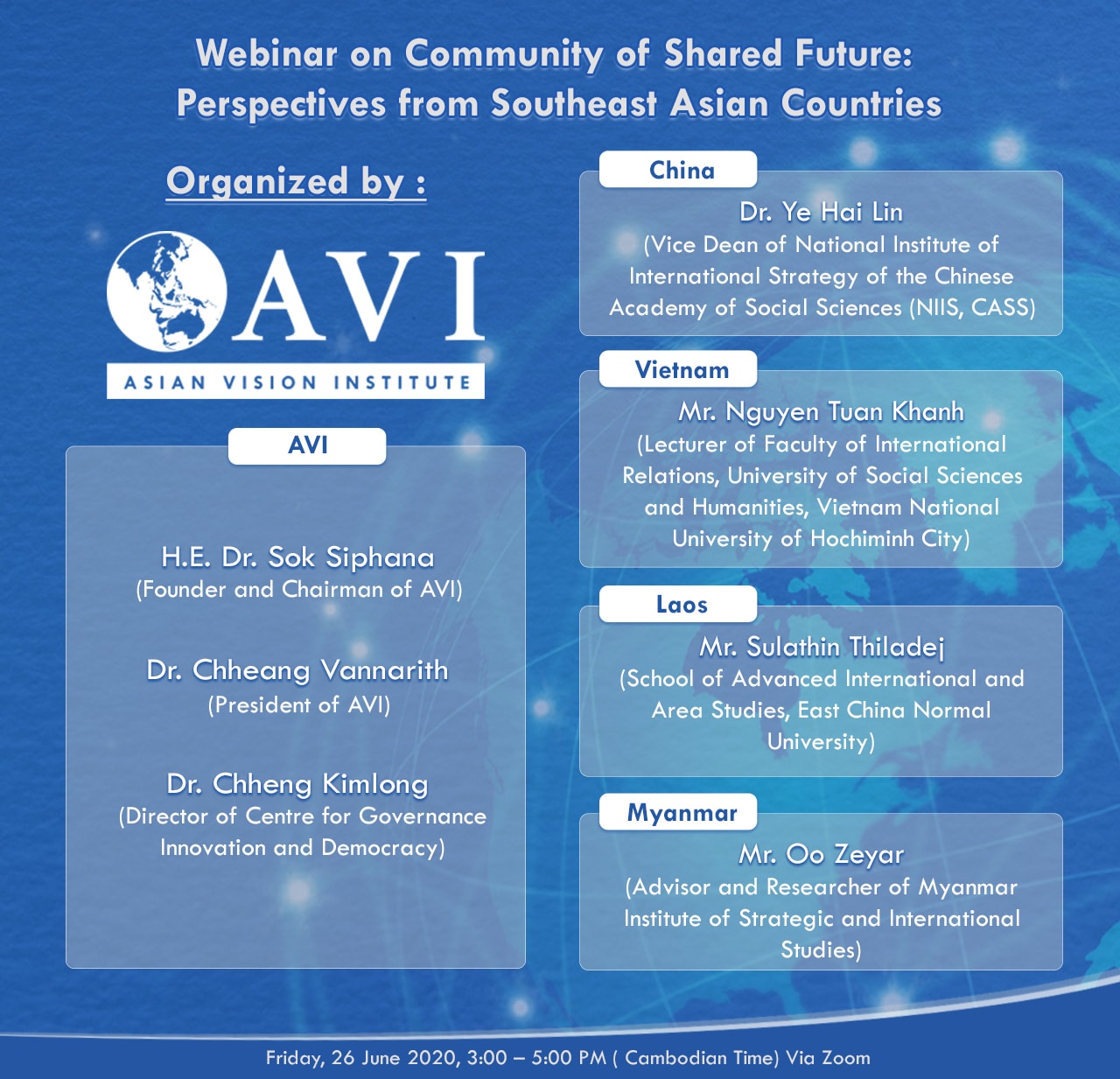 In this case, Cambodia may play a very important role in connecting China with the rest of Southeast Asian countries under the Asian Community of shared future for mankind, whose underlying conception is based upon people-to-people exchanges, deepened cooperation, people-oriented interests, and other positive contributions to regional and global peace and prosperity. Bearing this significance of this community, Asian Vision Institute (AVI), in collaboration with interested Chinese stakeholders and the Senate of Cambodia, propose to organise a webinar on “Building a Community of Shared Future: Perspectives from Southeast Asian Countries”.