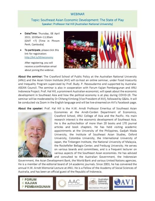 Would you like to gain an insight into the current and future prospects of Southeast Asian economies, particularly how they have been during COVID-19? Our joint web seminar (Thursday, 08 April 2021, from 10:00 AM to 11:30 AM Cambodia Time) between AVI and the Australian National University on “Southeast Asian Economic Development: The State of Play” will aim to answer this and other relevant questions. We invite Professor Hal Hill, the H.W. Arndt Professor Emeritus of Southeast Asian Economies at the Arndt-Corden Department of Economics, Crawford School, ANU College of Asia and the Pacific, to speak at the session. You will have a chance to ask questions and engage with him during the Q&A session. The seminar will be conducted via Zoom and live-streamed on AVI’s Facebook page.
