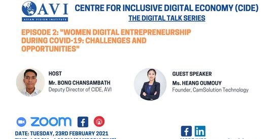You are invited to the second episode of the Digital Talk Series hosted by the Centre for Inclusive Digital Economy (CIDE) of the Asian Vision Institute (AVI). For this session, we will talk about “Women Digital Entrepreneurship during COVID-19: Challenges and Opportunities”. The session will be hosted by Deputy Director of CIDE, Mr. Bong Chansambath, and joined by our guest speaker, Ms. Heang Oumouy, Founder of CamSolution Technology. The discussion will be conducted in Khmer and livestreamed on AVI’s Facebook page from 4:00 PM to 4:30 PM.