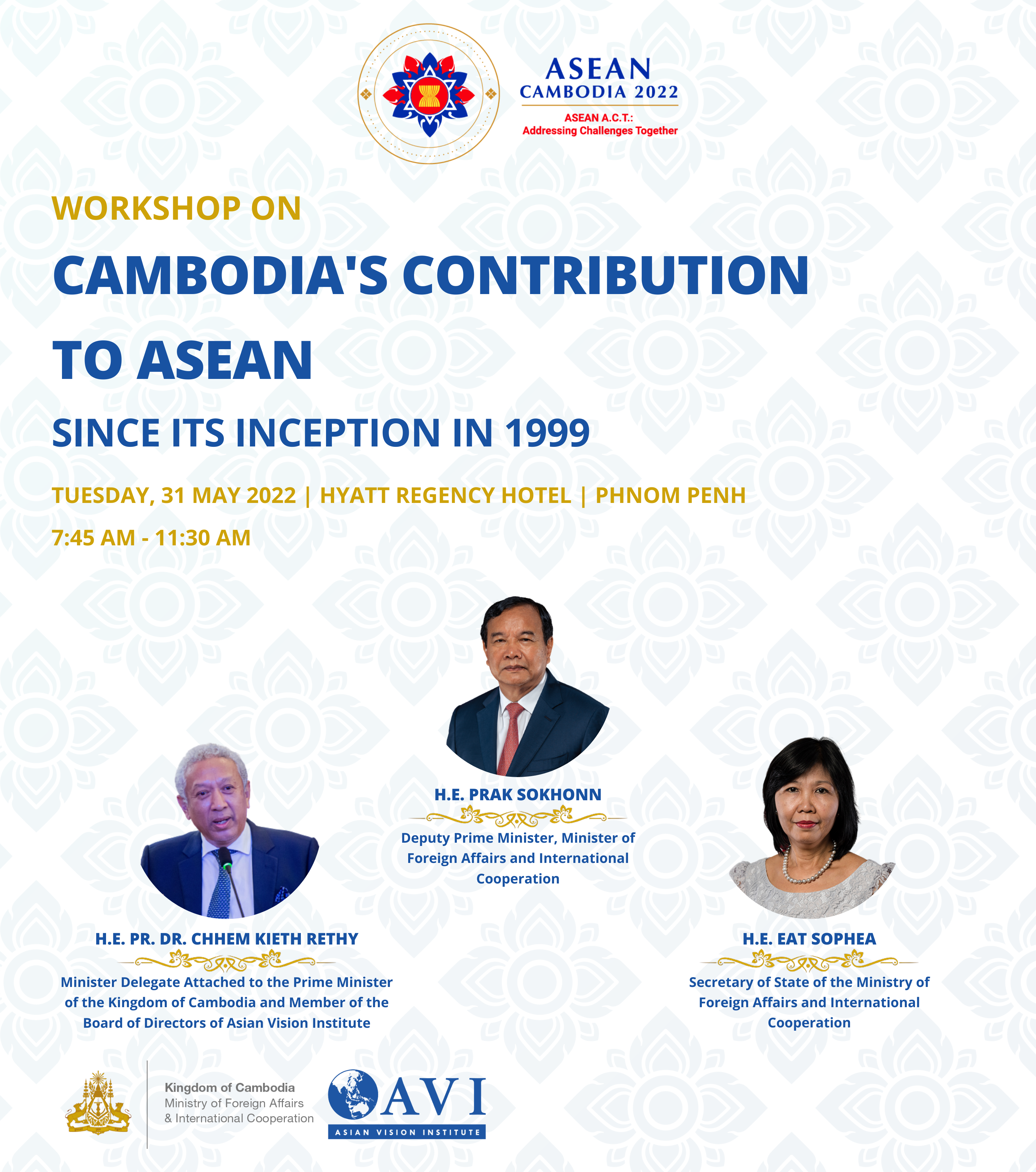 Asian Vision Institute (AVI), in cooperation with the Ministry of Foreign Affairs and International Cooperation of the Kingdom of Cambodia, will co-organise the Workshop on “Cambodia’s Contribution to ASEAN Since its Inception in 1999” on 31st May 2022 from 8:00 am to 11:30 am at Hyatt Regency Hotel Phnom Penh, Cambodia.