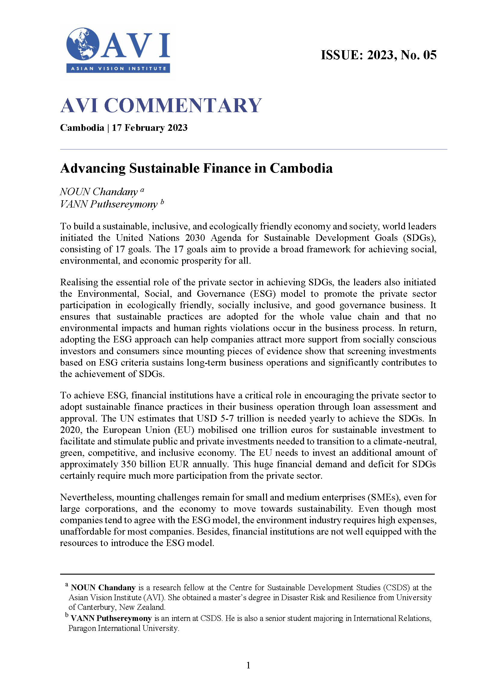 AVI COMMENTARY ISSUE: 2023, No. 05 | Advancing Sustainable Finance in Cambodia